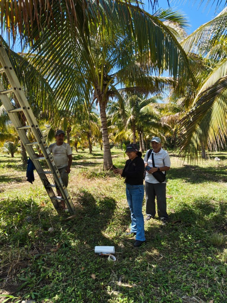 Ellos realizaron la toma de muestras para un estudio genético de nuestras variedades de palma híbrida verde y dorada, palma alta del Pacífico y enana amarilla malaya. Con estos estudios se podrá confirmar la identidad genética de nuestras palmas.